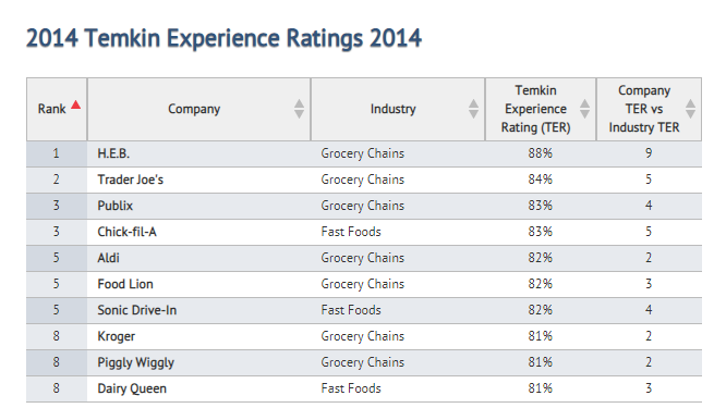 The Temkin Experience Ratings are based on consumer feedback of their recent interactions with companies. We asked consumers to rate three components of the experience, Functional, Accessible, and Emotional, on a 7-point scale. For each component, we take the percentage of consumers that gave a rating of 6 or 7 and subtract the percentage that gave a rating of 1, 2, or 3. This results in a “net goodness” rating for each of the three components. The overall Temkin Experience Rating is an average of the three “net goodness” percentages. For more information, see the Temkin Experience Ratings Overview.
